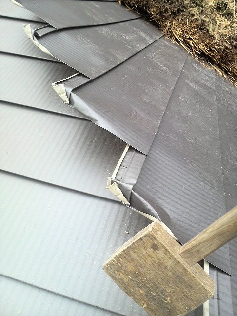 今回はとても珍しい現場でした~ かや葺屋根に増築部の屋根が~エエエエ~!!! う~ん困ったな~・・・・・ 早速工事にとりかかりましょう! とにかく、かや葺きの屋根の中に新規の屋根を どれだけ差し込めるか~ 右の写真の様に道具を使ってガンガン叩きこんでいきます 叩いた面が折れ曲がる事も計算しつつ 約50~60cm程差し込みます 勿論差し込み先は立ち上げて雨水の進入を塞ぎます!(写真左) ※ 画像をクリックして確認してください ※ どれだけ叩き込んだか分かりますよね~! この後叩き折れた部分はきれいにカットして 折り曲げて仕上げていきます 下の完成写真で確認してください~ 施工前 施工後 ※ 画像をクリックして確認してください ※ 足場も撤去して中々の完成具合です! ここからの眺めが一番カッコイイ!!! なんや機能美を感じるな~ 最後は現場から見られる絶景に癒されてもらいましょう! ※ まずは無料でお見積りを! ※ (有) 盛 光 板 金 工 作 所 大分県日田市中釣町473-1 TEL 0973-23-3860 PR
