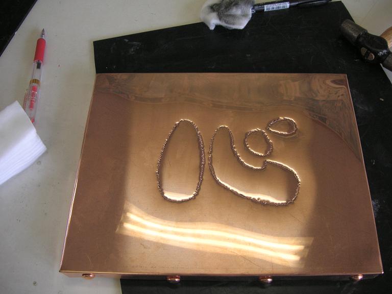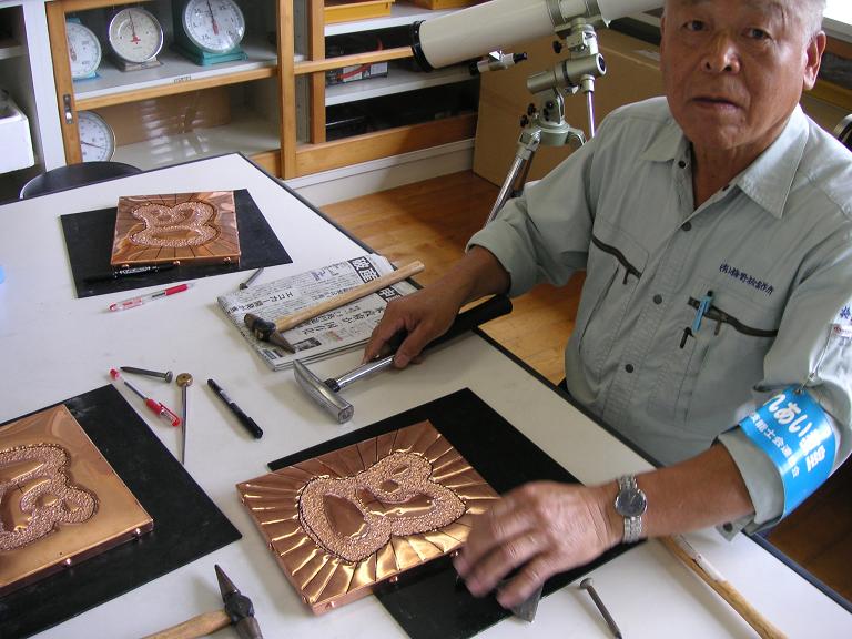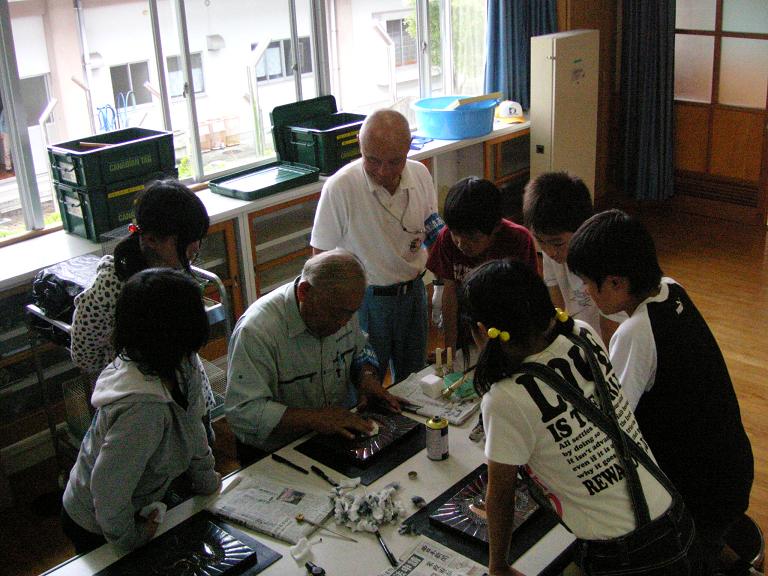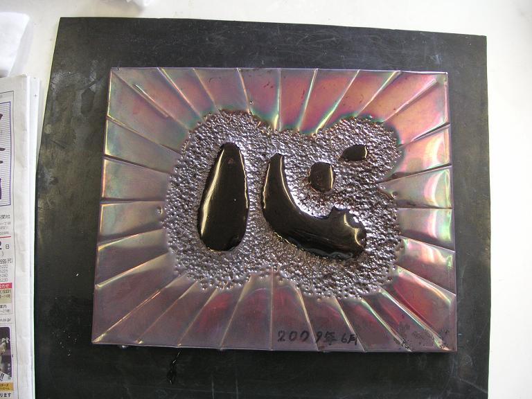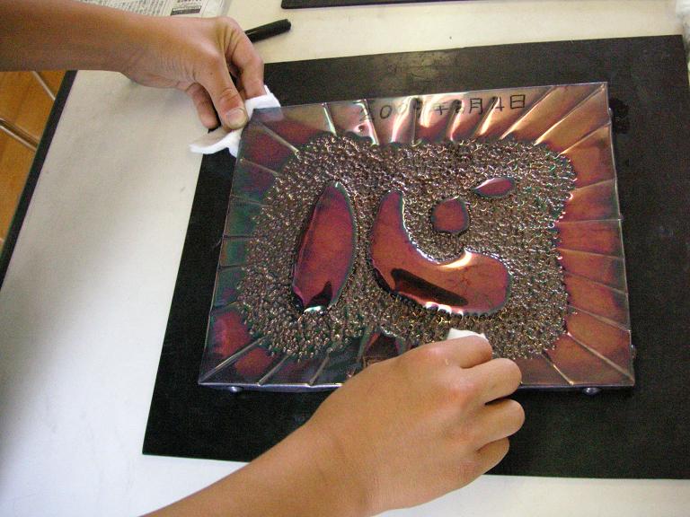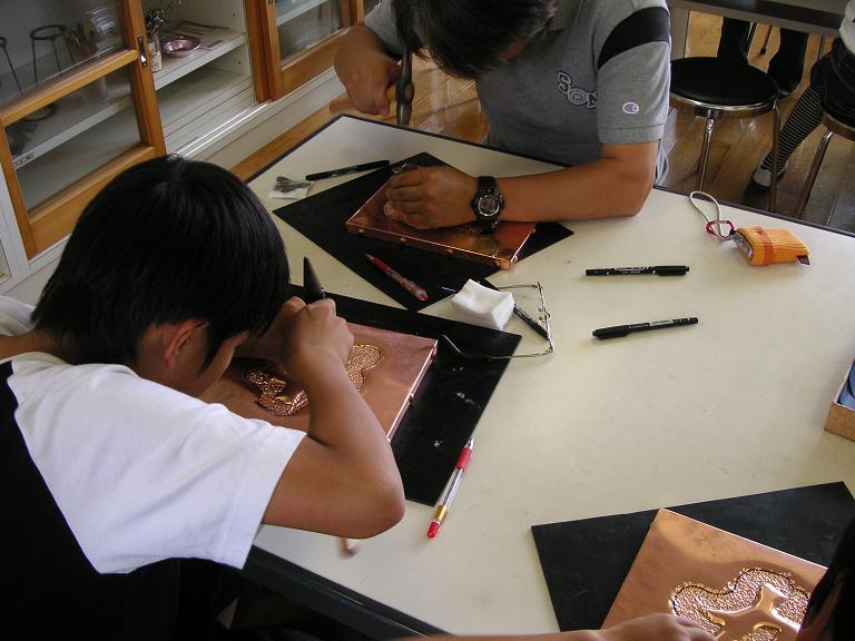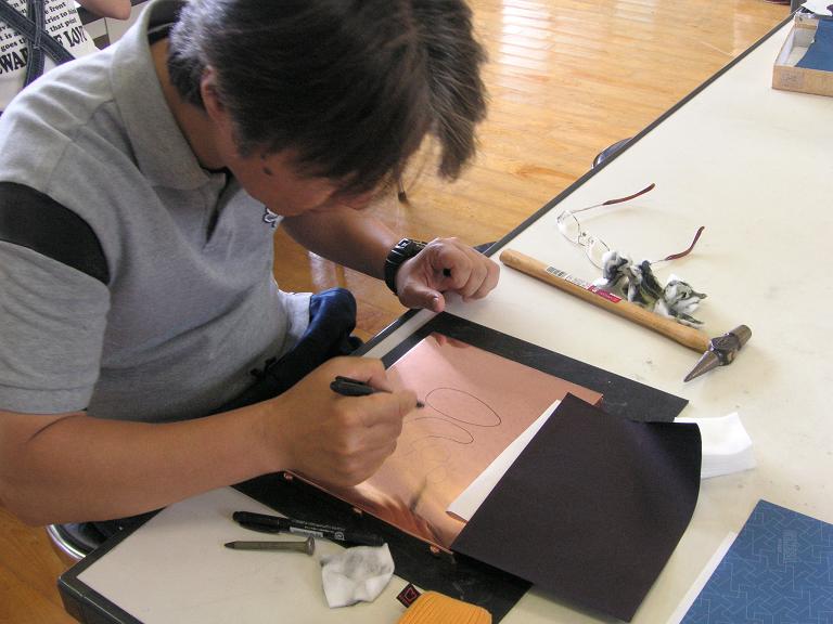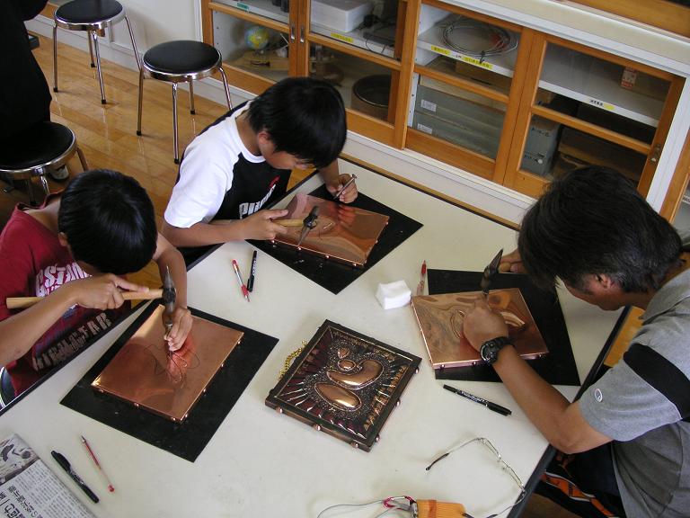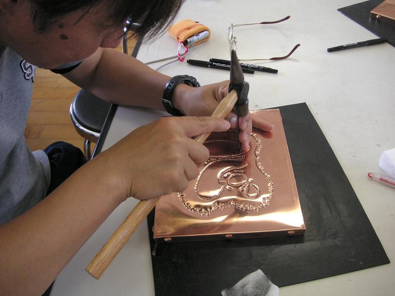 今回は銅板を使った作品作りです 講師の梅野先生が手順を説明していきます 銅板(0.35mm)をピカール(研磨剤)で磨きます。 カーボン紙を使って綺麗に写します今回は 「心」 まずは文字のラインに沿って釘で打ち込みます 穴が空かない様に出来るだけ強く打ちます 釘を少しづつずらしてラインを打ちます これがまた難しい! 講師の穴井先生 講師の方々もアドバイスをしながらトントントン 字の廻りを綺麗に打ち込みました この時点で少し文字が膨れています 文字から2cm程はずした所をまた打ち込んでいきます イメージは外から中へ 文字が膨れるように! 講師の仲摩先生 新聞社にパチリ! さ~ここからはヒタスラ釘を打っていきます もう手がダルイのナンノ・・・ 30秒打って休んで~30秒打って・・・ヒタスラ・・・ それでも無心で打つ込みます! 「 Don't think feeeeeeeel!」 先生方が飾りを打ち込んでくれました 無心で打ち込んで結果こんなに字が膨れました ここまで出来れば充分立派な作品です! 充分に磨いていきます ここで磨き足りないと綺麗な色が出ません さ~ここから薬品に浸けます この調合の微妙な変化で作品完成度が変わります 薬品に浸ける前に文字を油性マジックで塗りつぶしました それをシンナーで落とすと~~~ なんとも味わい深い色合いが出ました! 美しい! 子供達の作品ですがとても良く出来ています! 拍手!! ※ 画像をクリックして拡大してください ※ 今回は左官さんのコテ絵と、大工さんによる本棚作成もおこないました PR |