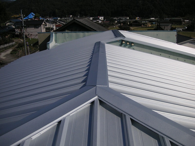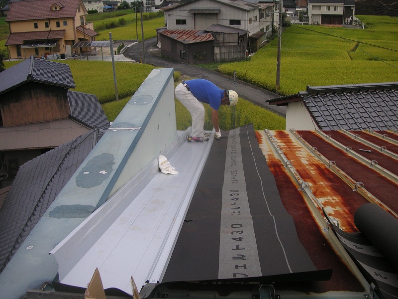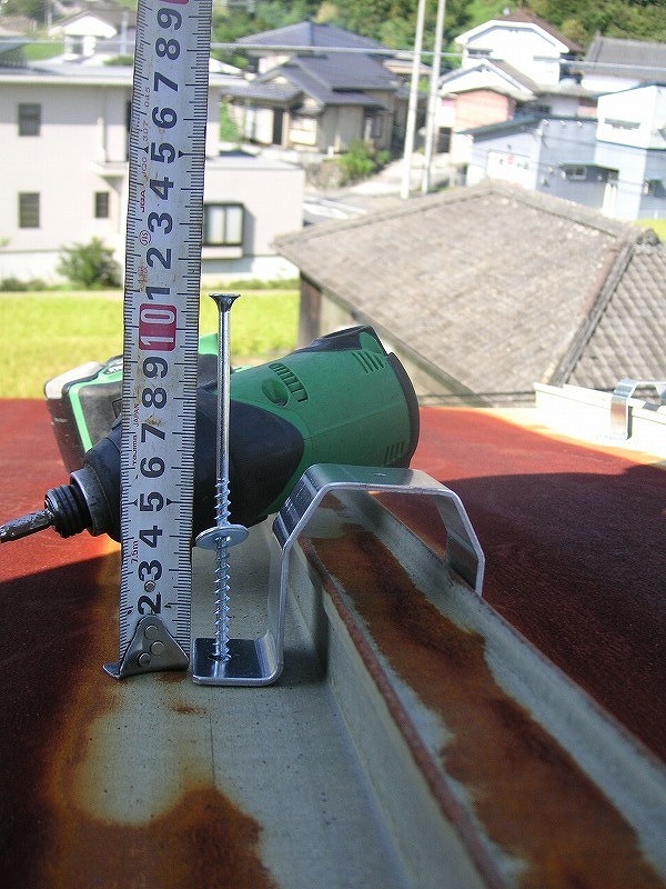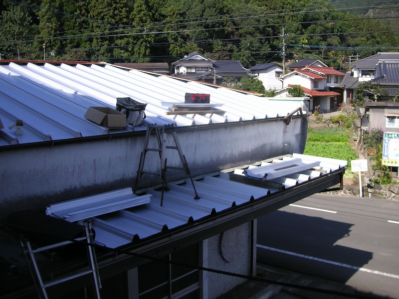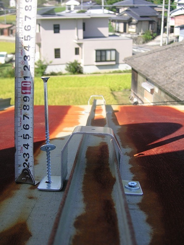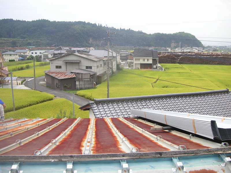 瓦棒屋根に折板をかぶせてみました~ 11月22日更新~ エンピツの先を注目してください!サビが進行しすぎて 手で触るだけでポロポロとモゲテ行きます・・・・・ ※ 画像をクリックして確認してください ※ 勾配がゆるいので水を流せば途中で水溜りが出来ます。 この為に毛細管現象がおきます。 元々勾配がゆるい屋根に木下地がたわんで この様な状況になってます。(写真↓) 今回瓦棒を葺かずに折板屋根に変えたのは瓦棒屋根に比べ 折板屋根の方が接合部分が高いからです。 (瓦棒屋根接合部分高さ・約2cm 折板屋根・約8cm) これで水が溜まったとしても毛細管現象が起こりません! タイトフレームを取り付けていきます ビスの長さに注目してください ※ 画像をクリックして拡大してください ※ タイトフレーム、換気面戸を取り付けた状態です 半分折板屋根を貼った状態です(写真↑) 写真左が折板屋根(新規) 右が瓦棒屋根(既存屋根) 施工前 施工後 ポリカ板(明かりとり)も取り替えてみました~ 上の写真にも見れますがポリカ屋根が波うってボロボロです ※ 画像をクリックして拡大してください ※ 施工前 施工後 写真を見れば一目瞭然ですが明りとりがスッキリしました! まずは無料でお見積りを! (有)盛光板金工作所 大分県日田市中釣町473-1