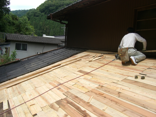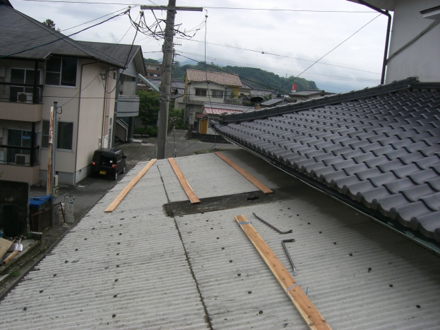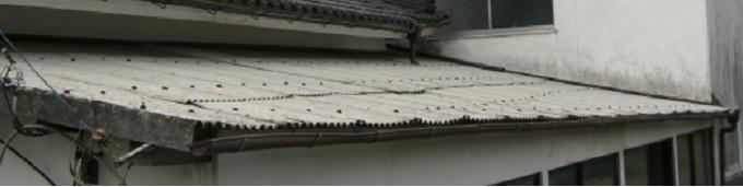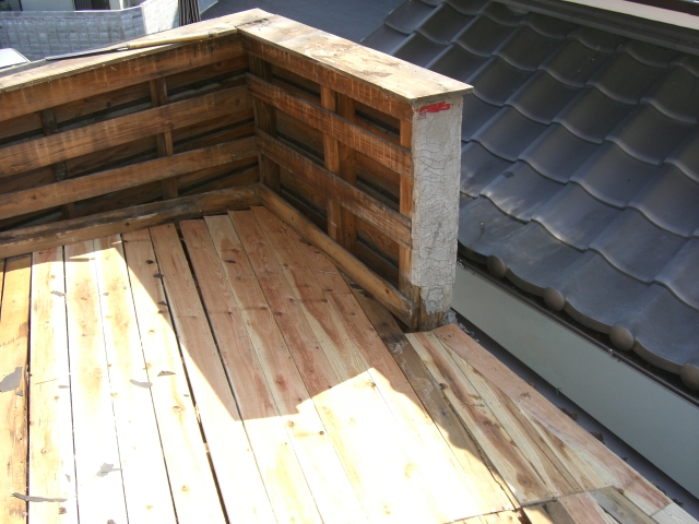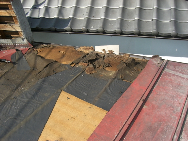 なぜ雨漏りが悪いのか??? 今更ですが雨漏りで困る事を挙げてみましょう。 屋根材(全般)が老朽化するとカビや錆、そのまま放っておくと 穴や亀裂が生じます。 そこから雨水が浸透して下地(木材や鉄骨・・・)を腐食させます。 完全に腐食すると釘やビス等利かなくなるのでリフォームする時に どこまでもやり直さなくてはいけません。 こうなる前に屋根材だけでもリフォームすれば、 予算も、工期も抑えることができます。 それでは雨漏りを放っておいたばかりに下地が腐食した写真をごらんください。 はいクリック! 目を背けたくなります・・・・・ 庇の軒先(木材)が腐れ、風が吹くたびパタパタ動く・・・・・