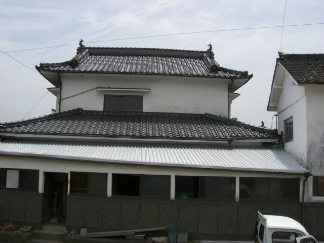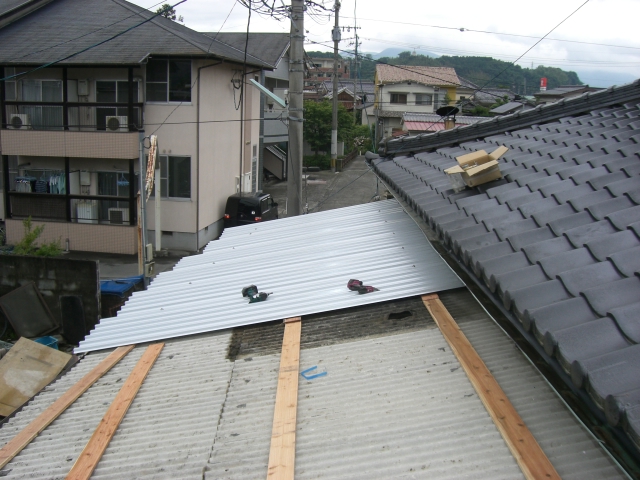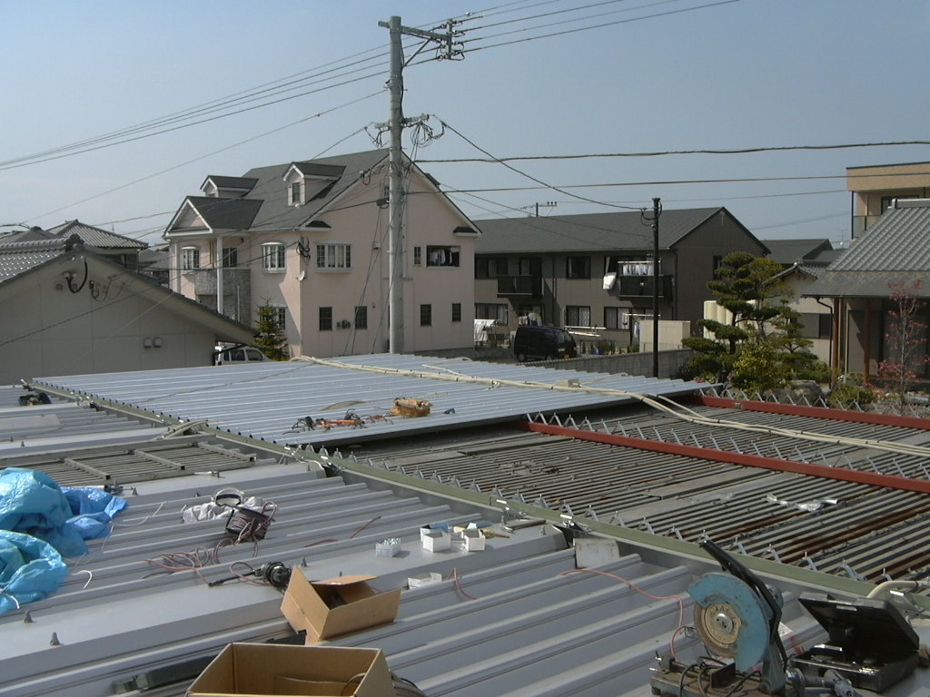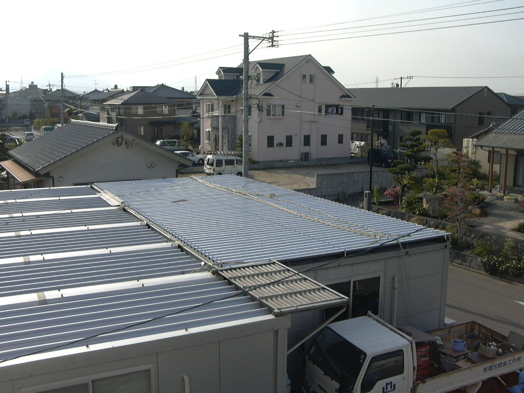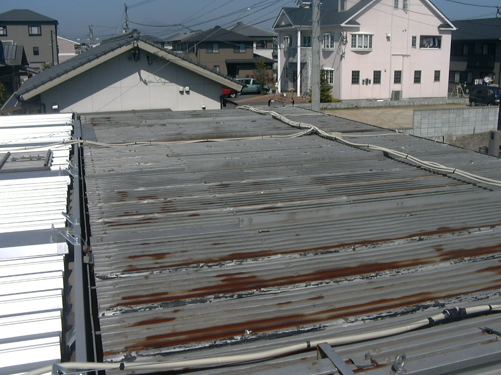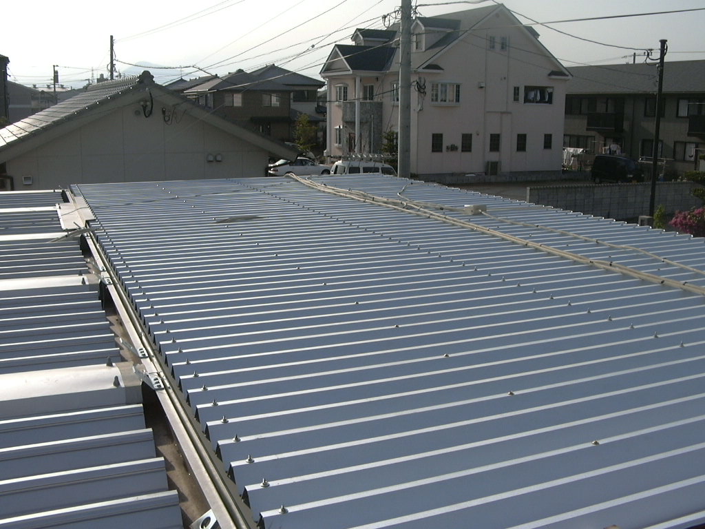 ス レ ー ト 屋 根 の 巻 スレート屋根は主に倉庫や、工場に使われる屋根材です。 老朽化が進むと割れやすく、穴が空いたりして雨水が浸透します・・・ そこで今回は・・・ ↑ この部分 カバールーフ工法で問題解決! 素材は勿論ガルバニウム鋼板! 今回はスレート材を撤去せずに直接貼り付けます。 大きな画像でどうぞ! はいクリック! この工法だと既存屋根がある状態なので 工期中雨の心配もありません! スッキリした完成写真図! 工期も2日弱でした! はいクリック! 違いは一目瞭然です! この長いビスで下地の鉄骨に直接縫います! 台風にも強いです! 倉庫の屋根を一新! 倉庫の屋根が雨もり・・・上ってみると・・・錆が・・・穴が・・・ そこで「カバールーフ」を施工 抜群の仕上がりです! 別の角度から まずは無料でお見積りを!