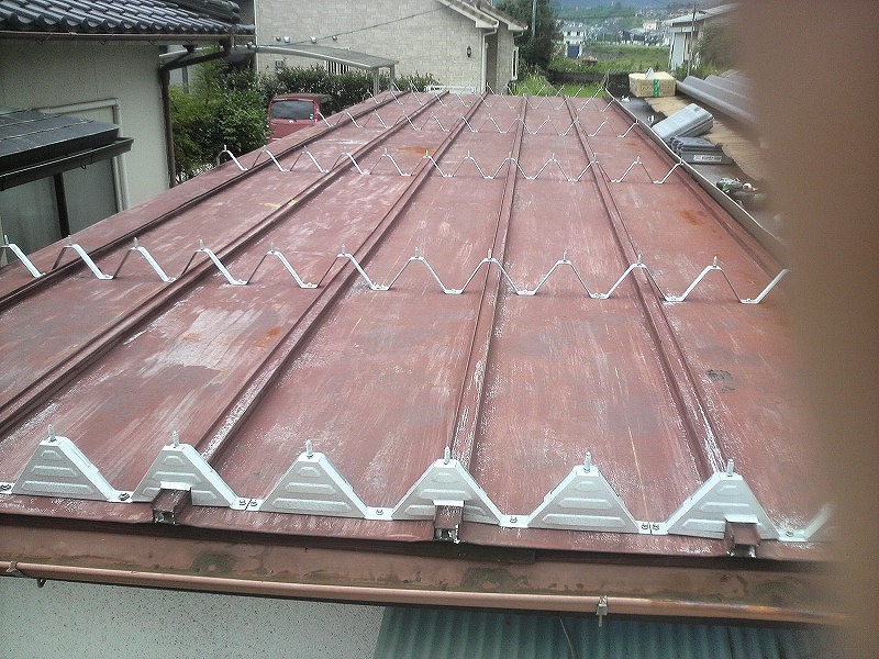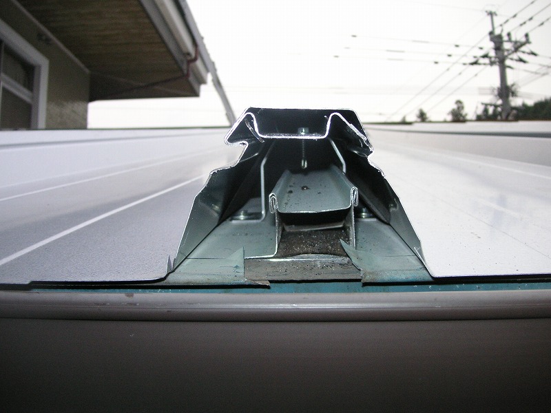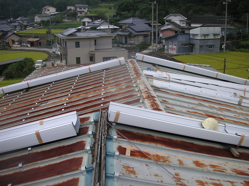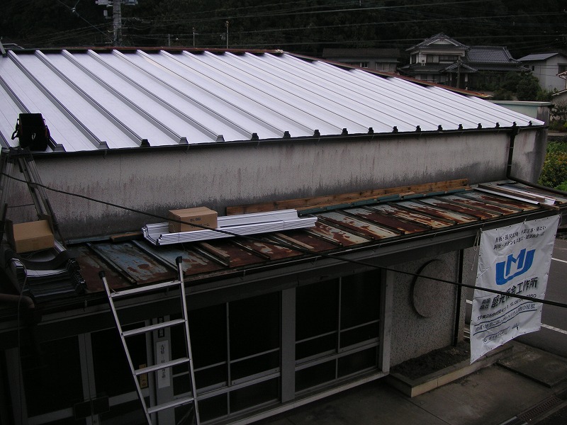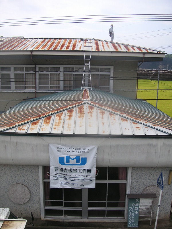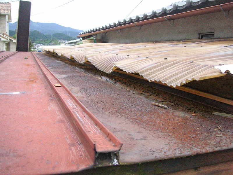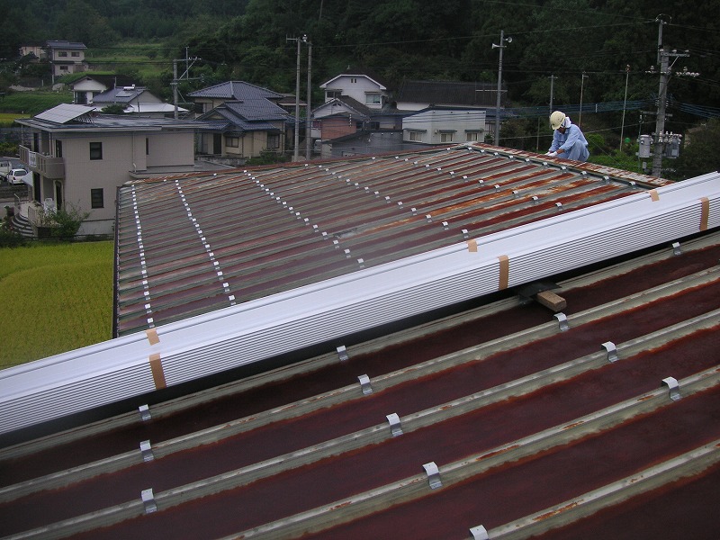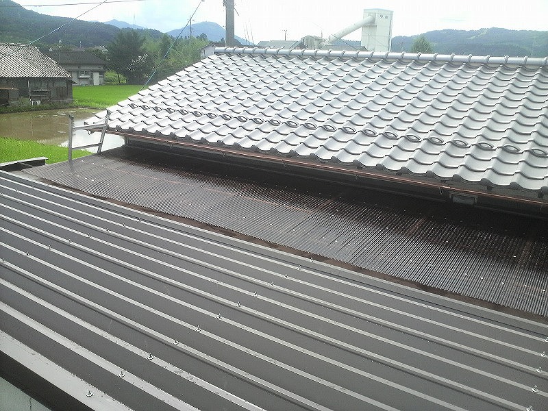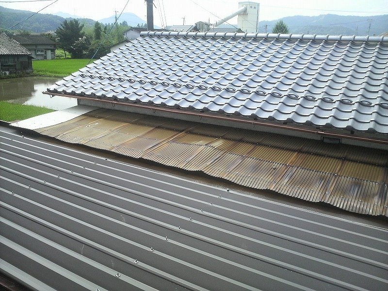 瓦棒屋根に折板をかぶせてみました~ 11月22日更新~ エンピツの先を注目してください!サビが進行しすぎて 手で触るだけでポロポロとモゲテ行きます・・・・・ ※ 画像をクリックして確認してください ※ 勾配がゆるいので水を流せば途中で水溜りが出来ます。 この為に毛細管現象がおきます。 元々勾配がゆるい屋根に木下地がたわんで この様な状況になってます。(写真↓) 今回瓦棒を葺かずに折板屋根に変えたのは瓦棒屋根に比べ 折板屋根の方が接合部分が高いからです。 (瓦棒屋根接合部分高さ・約2cm 折板屋根・約8cm) これで水が溜まったとしても毛細管現象が起こりません! タイトフレームを取り付けていきます ビスの長さに注目してください ※ 画像をクリックして拡大してください ※ タイトフレーム、換気面戸を取り付けた状態です 半分折板屋根を貼った状態です(写真↑) 写真左が折板屋根(新規) 右が瓦棒屋根(既存屋根) 施工前 施工後 ポリカ板(明かりとり)も取り替えてみました~ 上の写真にも見れますがポリカ屋根が波うってボロボロです ※ 画像をクリックして拡大してください ※ 施工前 施工後 写真を見れば一目瞭然ですが明りとりがスッキリしました! まずは無料でお見積りを! (有)盛光板金工作所 大分県日田市中釣町473-1