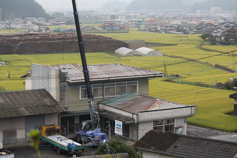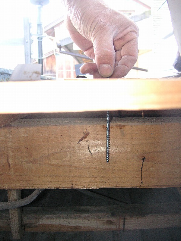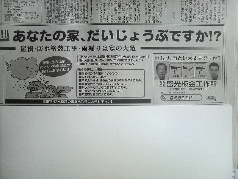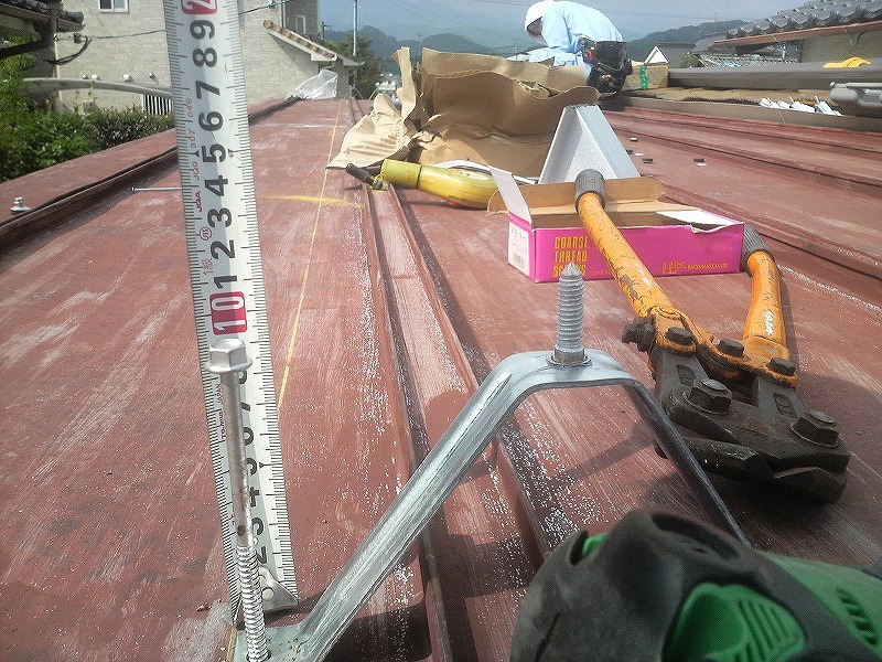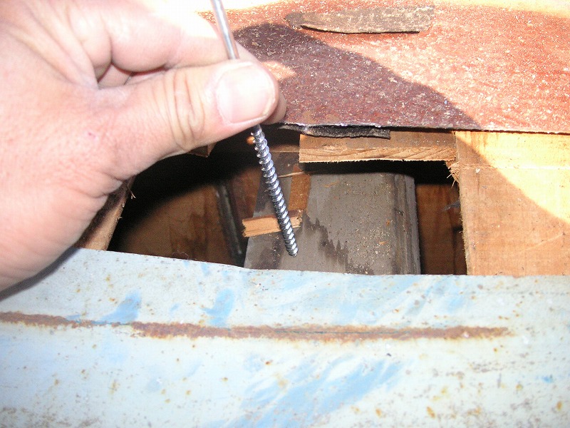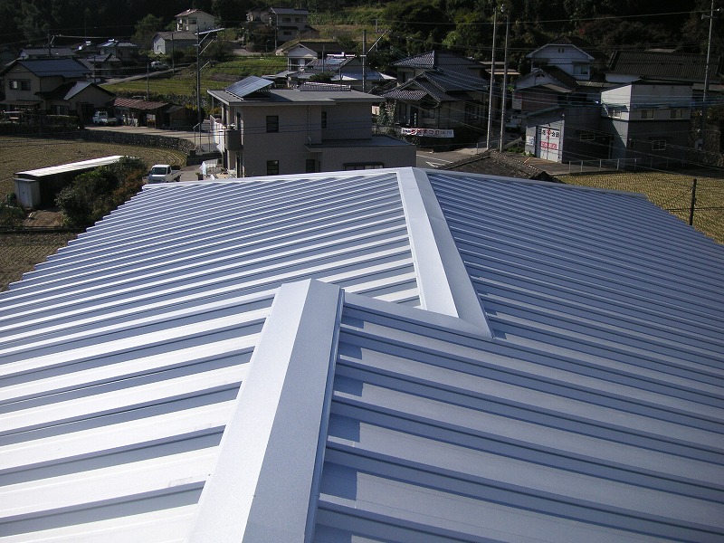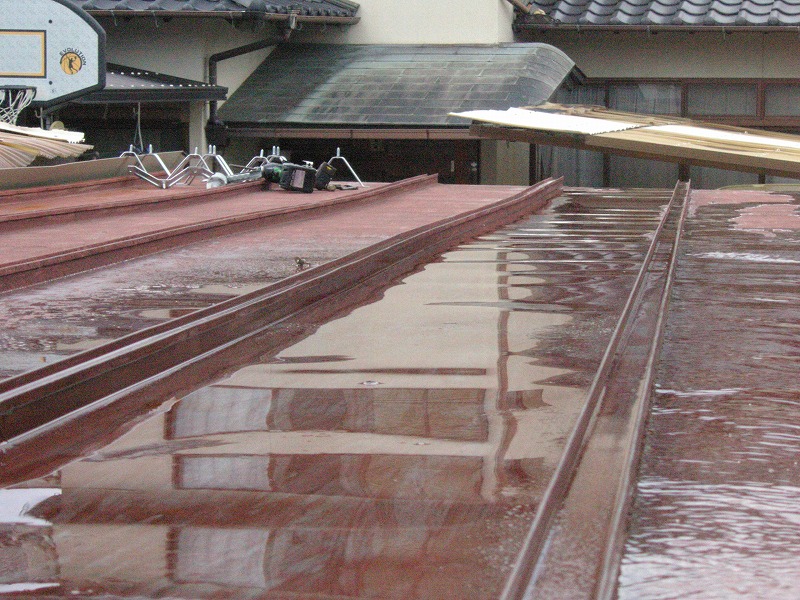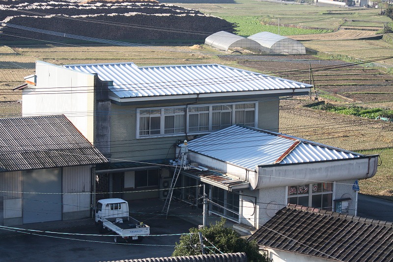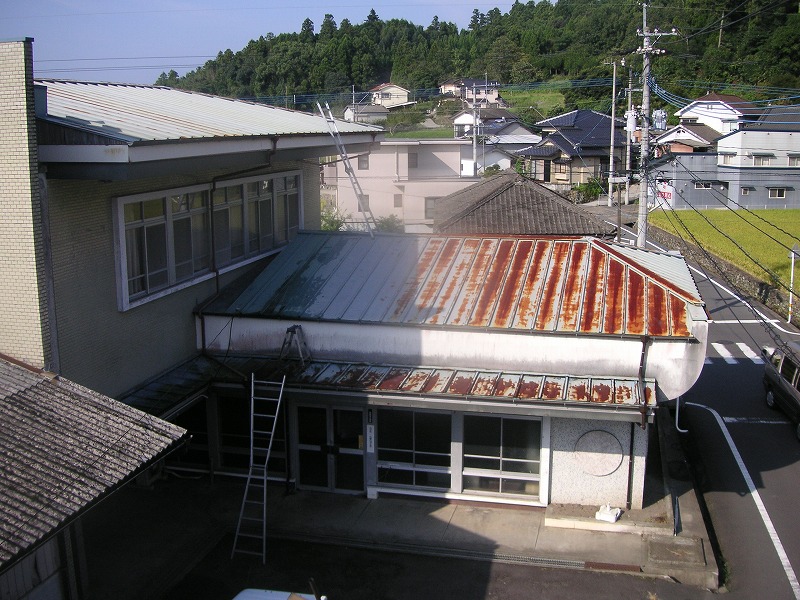 瓦棒屋根に折板をかぶせてみました~ 11月22日更新~ エンピツの先を注目してください!サビが進行しすぎて 手で触るだけでポロポロとモゲテ行きます・・・・・ ※ 画像をクリックして確認してください ※ 勾配がゆるいので水を流せば途中で水溜りが出来ます。 この為に毛細管現象がおきます。 元々勾配がゆるい屋根に木下地がたわんで この様な状況になってます。(写真↓) 今回瓦棒を葺かずに折板屋根に変えたのは瓦棒屋根に比べ 折板屋根の方が接合部分が高いからです。 (瓦棒屋根接合部分高さ・約2cm 折板屋根・約8cm) これで水が溜まったとしても毛細管現象が起こりません! タイトフレームを取り付けていきます ビスの長さに注目してください ※ 画像をクリックして拡大してください ※ タイトフレーム、換気面戸を取り付けた状態です 半分折板屋根を貼った状態です(写真↑) 写真左が折板屋根(新規) 右が瓦棒屋根(既存屋根) 施工前 施工後 ポリカ板(明かりとり)も取り替えてみました~ 上の写真にも見れますがポリカ屋根が波うってボロボロです ※ 画像をクリックして拡大してください ※ 施工前 施工後 写真を見れば一目瞭然ですが明りとりがスッキリしました! まずは無料でお見積りを! (有)盛光板金工作所 大分県日田市中釣町473-1