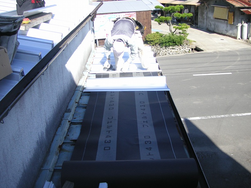 今回は瓦棒タイプのカバールーフ工法です まずはさまざまな方向から現場を見ていきましょう 屋根全体にサビが・・・・・このまま放置すれば雨漏りの原因に・・・ まずは金物(下地フレーム)を取り付けます ※ 画像をクリックして確認してください ※ ビスの長さをチェックしてください 材料搬入とタイトフレームを取り付けた状態です 既存の屋根にルーフィングを敷きます こうすれば貰いサビを阻止できます 続く~ 8割方仕事が終わりました~ 何とも機能的で美しい仕上がりです! 軒先の収まり写真です 庇にも貼っていきます ココもサビ防止の為ルーフィングを敷きます ビスに注目してください!ココまで長いビスを打込みます! ※ 画像をクリックして拡大してください ※ |